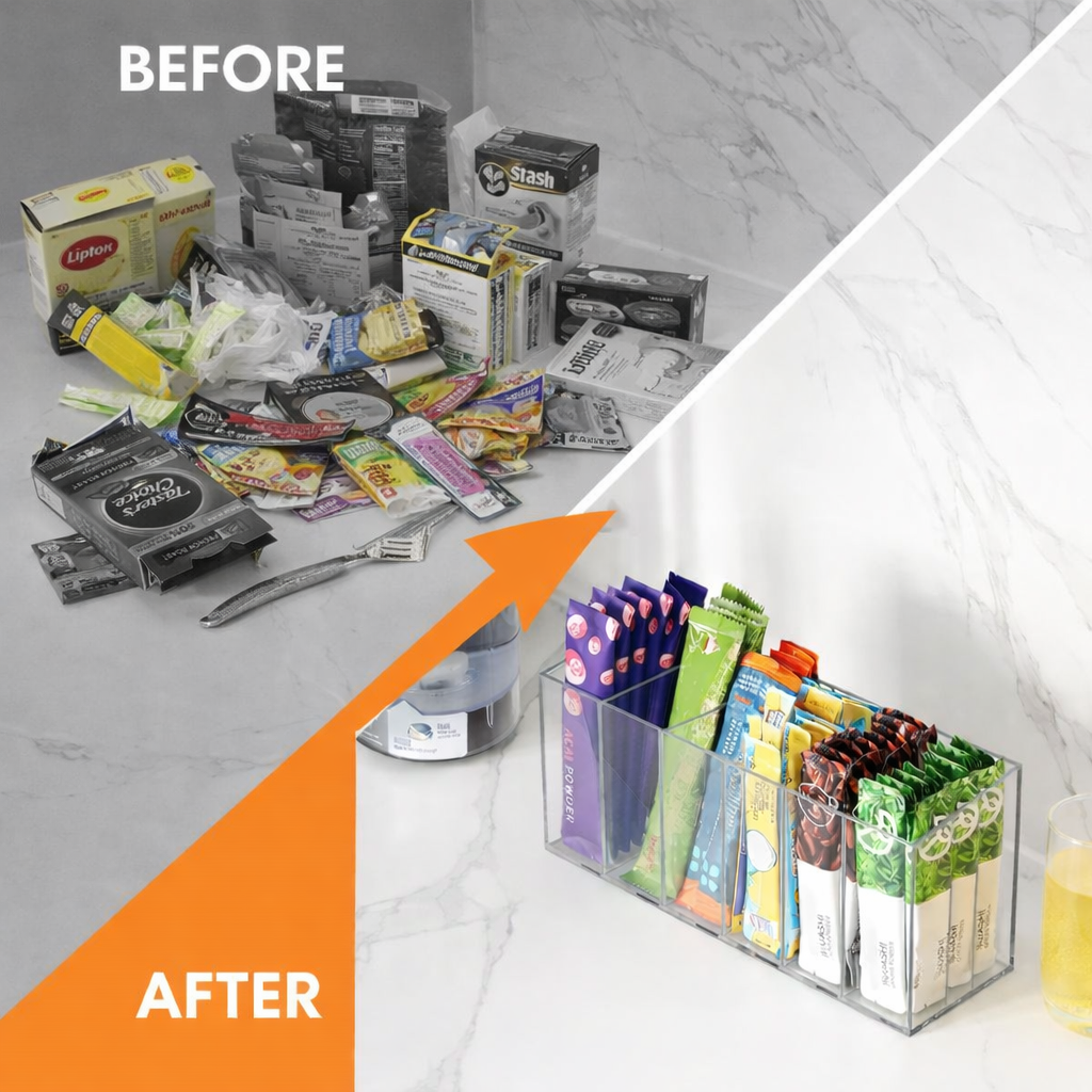 Perfect for organizing drink packets, tea bags, instant coffee, and more, this smart storage solution helps you maintain a clean, organized space while adding a touch of style to any room.